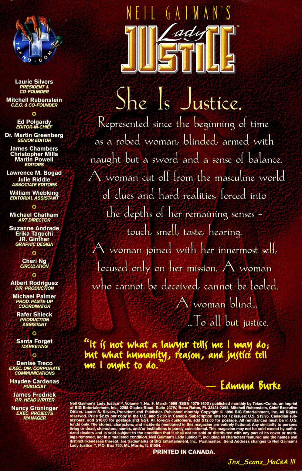 . Read 6 reviews from the worlds largest community for readers. Lady Justice is a comic book published by Tekno Comix starting in 1995It was created by Neil Gaiman and the first three issues were written by Wendi Lee with art by Greg Boone. Neil Gaimans Lady Justice 9 1996 You Own.